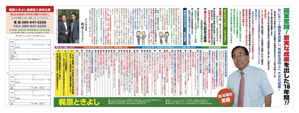 市議になり「緊張感ある松山市議会」に激変させ、梶原議員の議会質問はいつの間にか『梶原劇場』と呼ばれるまでになり存在感を示しています。